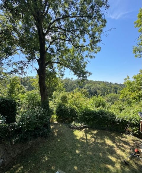 Das Grundstück liegt idyllisch in schöner Südlage, mit herrlichem Blick über den Wald. Hinter dem Haus hat es eine große terrassierte und begrünte Fläche und danach, ein Stück weiter nach unten, folgt eine weitere terrassierte Fläche, die aber schon Wildwuchs aufweist. Der letzte kleinere Bereich am Ende des Grundstücks ist verwildert